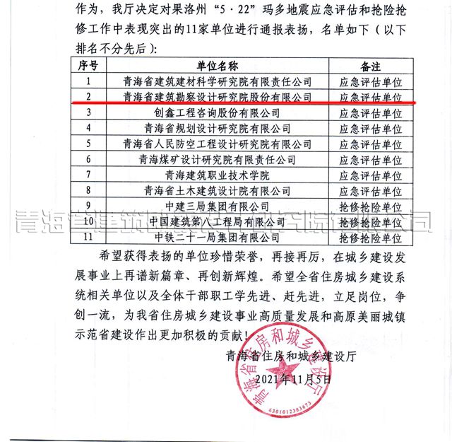 近日,青海省住建廳下發(fā)青建設[2021] 317號文件,對在果洛州“5. 22”瑪多地震抗震救災工作中表現(xiàn)突出的11家單位和企業(yè)進行表揚通報,我公司在表揚通報之列。